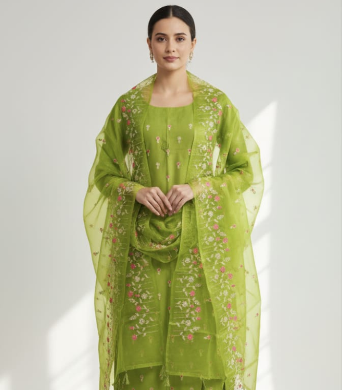 Be the first to review “Pure Chanderi suit featuring intricate embroidery on the top and dupatta, crafted for a rich and elegant look” Cancel reply