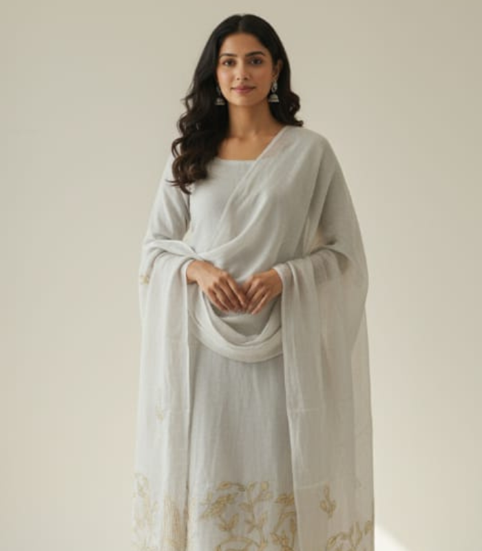 Be the first to review “Pure linen copper zari suit featuring crush tissue patchwork on the shirt and dupatta, paired with a comfortable cotton bottom.” Cancel reply