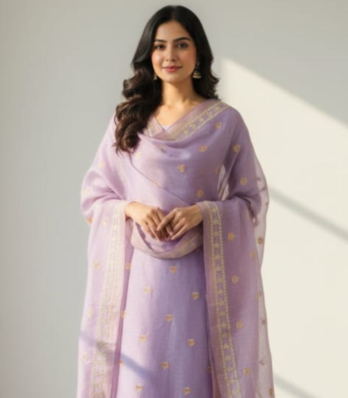 Pure Kota organza suit featuring delicate cutwork on the shirt and dupatta, paired with a soft cotton bottom.